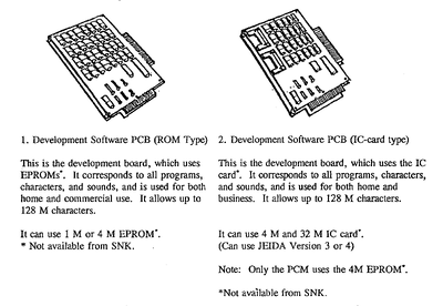 Big development cartridges are referred to by SNK as "Development software PCB". They exist in two forms : EPROM type, and flash card type. Did they later on evolve to only one mixed form ?